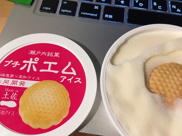 高知アイス、久々に食べました。や、ポエム!懐かしいのです!子供の頃大好きでした。で、買ったのです、これ。どうよ、どうよ、と。蓋を取りましたよ。や、分かってはいた。芋けんぴアイスの時に、アイスの上に芋けんぴが乗ってたので分かってはいた。今回も。ちっこいポエムが埋まっていた。でもポエムだ。アイスは優しい感じのミルクセーキ風とでも言いましょうか。おいしい。もちろん凍ったポエムもおいし。
