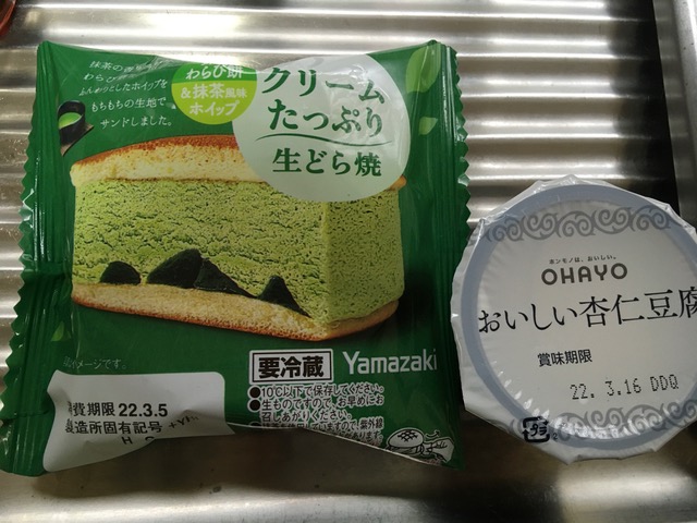 ヤマザキの生どら焼き、抹茶のやつだ。わらび餅いいねぇ。このシリーズ美味しい。昨日は皮がベッチャリと言ったが、うん言い過ぎだ。しっとりです。はい。杏仁豆腐はおはよーの4つ入りのやつ、おいしい杏仁豆腐。うん。私、このシリーズはプリンより杏仁の方が好きだな。