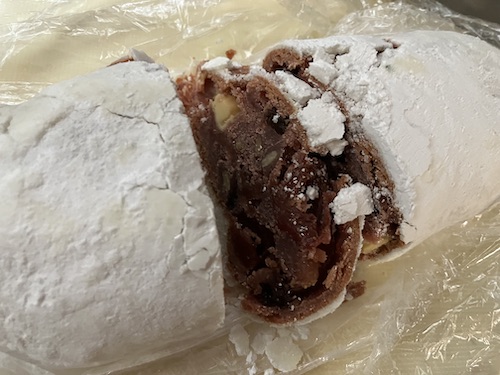 2025-11-27 いちごのシュトーレン 岡山、鳥取のおやつ 焼き菓子 朝8時半です、室温11度、流石にこの時間は明るいです。昨日もいつもと同じ日常、干し柿はそろそろできているかな?と思い1つ食べてみたが…う〜ん、種の周りにまだ渋みが残ってました。そして外っ側は結構硬い。母がお友達にもらった干し柿は全てが柔らかくそして甘かった。どういうことだ?お昼ご飯は前日のひき肉と白菜の旨煮に豆乳を入れてスープに。晩ご飯は春巻き。そしておやつはパブリックで買ったいちごのシュトーレン、うわ〜〜〜いちごだぁ。美味しい。