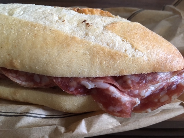 2019-07-27 サラミのバゲットサンド 総菜パン #食べ物 人と接するのって、めんどくさい? なんか、色々カーストとかあるしな。 難しいなぁ。 お昼ですね。気温27度。湿気のせいかな、こっちの方が俄然暑く感じる。帰りの飛行機でダンボを観た。あ~すごくかわいかった。や、ま、いっかな?って思ってたの、ティムバートンだけど、ま、いっかなって、あ~、劇場行けばよかったな~。や、ちっこい画面はそれはそれでいいのよ。ちゃんと収まって見えるからさ。 「サラミのバゲットサンド」 ポールだわな。合宿中のお昼ご飯です。サラミとバターとピクルス。シンプルです。うん。おいし。